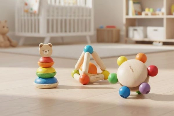 PlanToys offers stacking toys, push-along animals, and pretend play kits that encourage creative play and fine motor development. Their wooden construction and smooth surfaces make them favorites among eco-conscious parents.